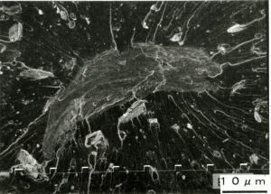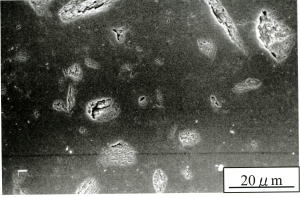 図7は試験片表面のSEM写真であるが、貝殻と母材の接着性は余り良くないことが分かる。これらが強度のばらつきの原因と思われる。図8は引張破面写真であるが比較的接着性がよいが、この部分から破壊が開始した様相を示している。