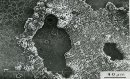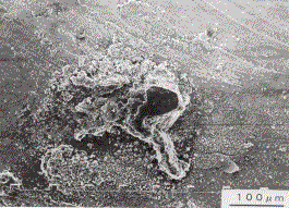 Fig.5は,腐食を生じた箇所の電子顕微鏡写真であるが,異物の付着とこれと同程度の大きさの穴が多い。未使用材もFig.6のように,腐食孔と思われる箇所が存在する。この場合は孔底にも結晶粒が観察される。しかし,腐食部に存在する穴は,サイズがかなり大きく,孔底は押しつぶされた状態である。また,付着物の頭は押しつぶされた状態のものが多く(Fig.7),酸化物はこの近傍に多い。この不着物の成分を調べるために,マイクロアナライザーで成分分析を行った。