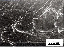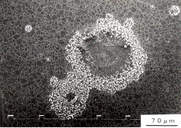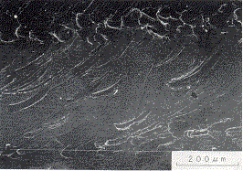 Fig.13は加工部の電子顕微鏡写真であるが,酸化物がみられる。酸化物がドーナツ状をしており,中心部は周囲と同じような傷が残っていることから洗浄のため鉄粉本体がが抜け,酸化物だけ残った箇所と思われる。腐食孔は多少観察されたが,未使用材の場合より少なかった。また,水道水,3%食塩水の場合も腐食の様相に大差なかった。