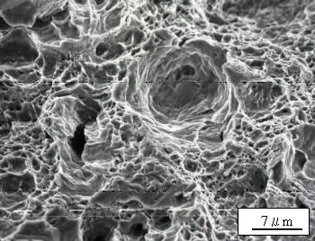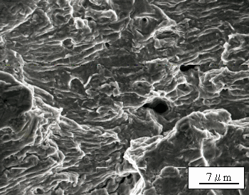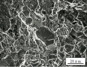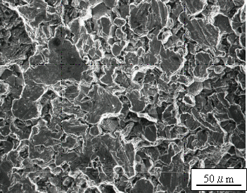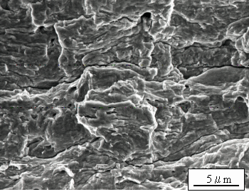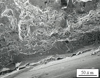 | 図5は図3の中間領域の写真である。疲労破壊のかなりの部分に粒界破壊が見られる。不明瞭であるが疲労特有の縞模様、ストライエーションも観察される。 | ||||