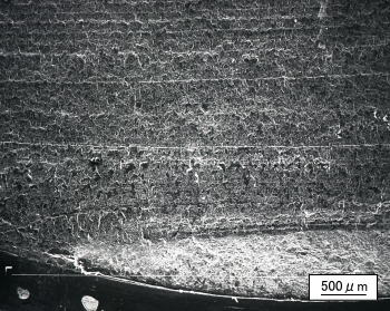 | 図2に示すように、破面に隣接するねじ底部から多数き裂が発生していた。ねじ底部に発生したき裂のうちの一つが主き裂に成長し、破壊に導いたと考えられる。 破面解析の結果、き裂は、ねじ底部から多数発生し、このうちの一つが主き裂に成長し、疲労破壊した。 図3は、破面写真で、疲労特有な不連続成長帯が観察される。なお、電子顕微鏡観察では、疲労特有の縞模様、ストライエーションが認められた。 |
