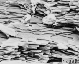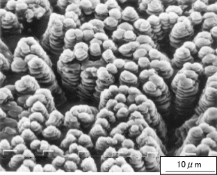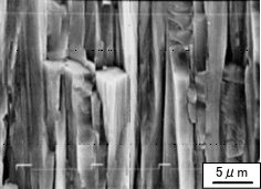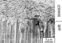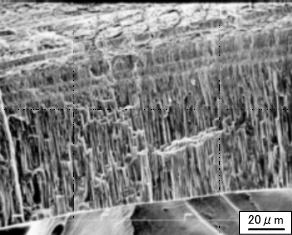 葉状構造の内面層@の拡大写真 方解石の柱状結晶。約3μmの方解石の柱状の結晶が表面に対してほぼ垂直に並んでいる。生きているときは、結晶間にはタンパク質が連続的に入っている。乾燥状態では、隙間ができ、有害物質等が吸着される |