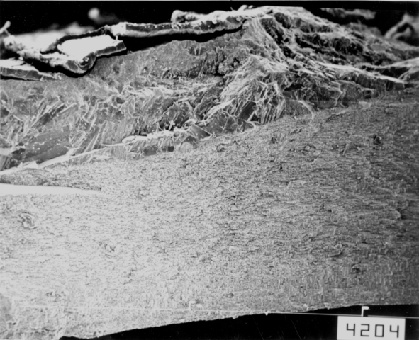 | 交差板構造の中間層A,方解石の細長い結晶の束が交互に並んでいる。表面に対してある一定の角度をなし、合板のような構造で、この層が強度を担っている。薄くても強い構造である。 | 上半分は内面表面であり、葉状構造の先端部である。下半分は、断面である。柱状の結晶は方解石である。 |