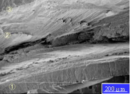 | 引張試験で貝殻を破断させ、断面を電子顕微鏡で観察 | 約200 μmの厚さの葉状構造の内面層@、交差板構造の中間層A、約50μmの外面層B |
