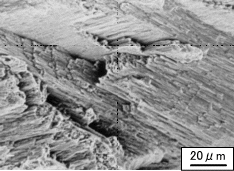 | ピラミッド構造の拡大写真 | 表面に対してほぼ垂直方向に、約0.5μmの厚さのアラレ石の板状結晶が規則正しく積み重なり、隣接する結晶とかみ合い構造上の強度を得ている |