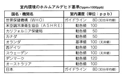 | ホルムアルデヒド | 100μg/m3(0.08ppm) | 合板,壁紙,建材用接着剤,壁紙の接着剤 | 発ガン性,発ガン促進作用,アトピー,ぜん息,アレルギー |