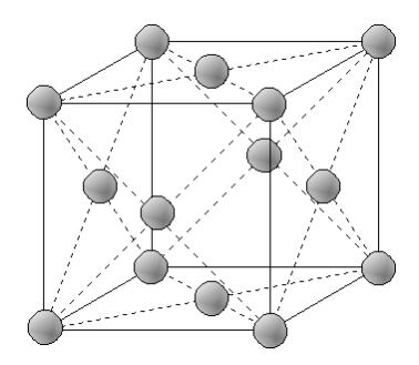 | 面心立方格子(Face Centered Cubic Lattice,略して F.C.C)の単位胞は,図1.4のように,立方体の各隅と各面の中心に1つの原子が配置し,14個の原子で構成されています。 密度は0.74で,Au, Ag, Cu, Pt, Al, Ni, γ-Fe(高温の鉄)等が代表的な金属です。変形しやすく箔に加工できる金属です。 |