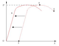 ある応力(上降伏点ないし降伏開始点)で塑性変形(すべり変形)が急激におこり,その応力またはそれより小さな応力(下降伏点)で塑性変形が進んでゆく。A点に