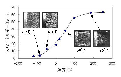 | 0.23 %炭素鋼と熱処理したS50C(炭素量0.5%)の温度依存性を調べた。0.23 %炭素鋼の場合は,Td = -130℃,S50Cの場合,Td は室温付近である。加熱すれば延性材料に変化する。このように,材料は一般的に温度によって性質が変化する。 |