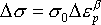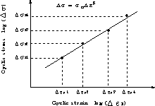 塑性ひずみ幅△εpと寿命Nfで評価する。この量の間には,両対数でプロットしたとき直線になり,Manson-Coffinの式(マンソン−コフィンの式)が成り立つことがわかっている。 |