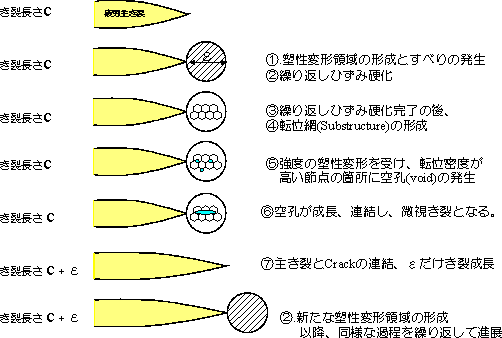 | (1). | 高サイクル疲労におけるき裂伝播の様式 以上は、低サイクル疲労試験の巨視的関係を示したが、高サイクル疲労における疲労き裂先端の局所的領域では、応力集中のため降伏応力以上になる結果、塑性変形、ひずみ硬化、空孔の発生、連結、主き裂の成長の過程を経て、不連続的なき裂の成長を示す。この塑性領域において、低サイクル疲労と同様な現象が生じていることが分かっており、高サイクル疲労における疲労き裂伝播の理論において、き裂先端の局所的領域での組織変化の様相として低サイクル疲労で得られた情報が適用されている。 「疲労き裂伝播の不連続性」については別ページを参照。 |