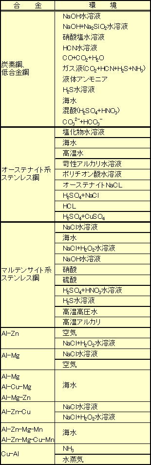 金属が一定の引張応力の下で特定の腐食環境に置かれると一定時間後に割れを生じ破壊する。一定応力は外荷重でも冷問加工,溶接や熱処理による残留応力でも同様である。