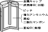乾電池を抵抗の小さい金属線て短絡すると亜鉛電極は数時間以内に腐食によって穴があくが,導線を接続しない状態では亜鉛の消耗は極めて少なく,この状態のわずかな亜鉛の消耗は鉄のような不純物により,この不純物は炭素電極と同しような働きをし、電流が亜鉛と不純物の間に流れ亜鉛は腐食する。このような電流を局部電流といい,相当する電池を『局部電池,|ocalaction cell』と言う。 |
