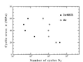 金属が腐食性の環境で繰り返し荷重を受けると疲労現象が一層促進される。これを腐食疲労と言う。環境が腐食環境でない場合,鋼は一般に耐久限度(この大きさの応力振幅以下の荷重に対しては金属は無限の練り返しに耐える)を示すが,環境が腐食性の場合は耐久限度を示さなくなる。つまり小さな応力でも繰り返し負荷ざれると腐食性環境では疲労破壊することを意味している。 |