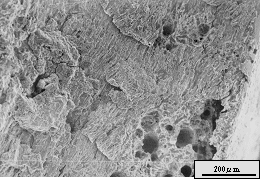 図5.12は漁網取り付け金具が、海水中で疲労破壊を起こした破面である。表面近くで偏析した不純物が破壊の基点になっており、ストライエーションの形状も空気中のものとは様相が異なっている。
