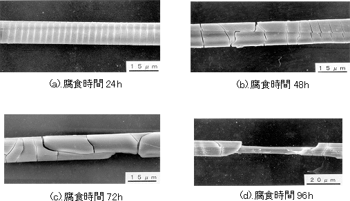 図5.14は無負荷でのEガラス繊維の腐食の様相を示したもので、,3.5%HCl水溶液環境中である。ガラス中のCaとAlが酸中にイオンとなって溶け出し,分子容の変化が生じた結果,表面層と酸に犯されていない繊維中心部間に応力分布が発生し,酸による応力腐食割れによりき裂が生ずると報告されている.しかしながら,腐食の形態から,繊維製造時の残留応力の分布状態も大きく影響していると推定される.荷重を負荷した場合は一層腐食が進む結果を得ている。 |