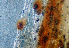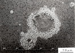 ステンレスの場合,炭素鋼と異なり,一般的には腐食は受けないのが通例である。しかし、異物が載った場合は場合はすきま腐食を生ずる(図5.13(a))。図5.13(b)は、SUS304ステンレス板の上に炭素鋼の鉄粉を載せ水道水に浸した場合で、白い部分は鉄粉の腐食時の酸化物であるが中心部ではステンレスに腐食ピットが生じていた。 |