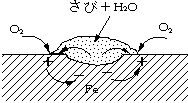 図5.5はさびやその他の反応生成物におおわれた金属面に達する酸素の量が,裸の金属面の酸素量より少なく,孔食の部分がアノード(−)となりFeが溶け出し,腐食は一層進む。その他,2本の鉄管の継ぎ目や鉄管のねじ込み部の腐食などである。