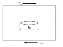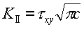 | で表され、αは試験片の形状、大きさやき裂形状、負荷応力の形式によって決まる無次元量である。 モードUのせん断形式の場合は次式のようにもとめられている。 |