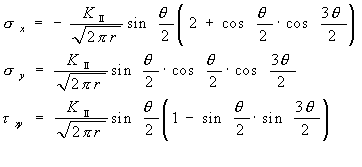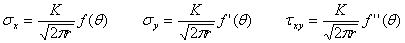 | ■き裂による応力分布と応力拡大係数 各モードにおけるき裂先端の応力分布は次のように求められている。モードTの引張形式の場合は次式のようにもとめられている1),2)。 |