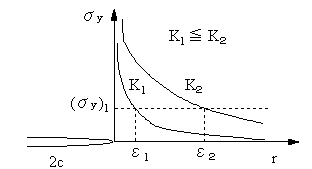 | 図12は応力拡大係数K1, K2の場合のき裂先端局部領域における応力σyのθ=0の応力分布状態を図示したもので、両者ともr→0ではσ→∞なります。同じ位置rではσyは応力拡大係数が大きいほど大きくなります。この傾向は応力集中係数と同様です。一定値(σy )1 以上の応力が生ずる範囲も応力拡大係数が大きいほど広くなります。 |