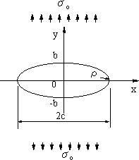 | 式(1)でr=c, θ=π/2とr=-c、3π/2で、σθ=3σとなり最大値を取り、3倍の応力集中となる。 長軸2c、短軸2bの楕円孔の場合は式(2)のように求められている。 |