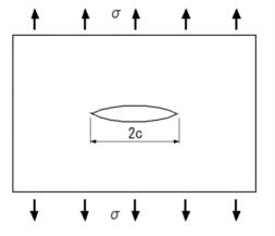 | 有限寸法の板、形状に存在するき裂の場合に、応力拡大係数は と表すことが出来る。αは試験片とき裂の形状に依存する係数である。 |
