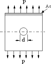 薄く、幅の広い板(理論的には無限に広い、無限板)に、丸い小さな円孔が存在し、引張荷重Pを加える場合を考える。無限に広いとするのは、幅が小さいとこの影響があるからである。円孔のある断面積Aは円孔がない断面積Aoに比べて小さい。従って,引張応力σo=P/Aoより,円孔のある断面上の応力σ=P/Aは大きいことが予想される。しかし,実験で調べてみると,予想よりかなり大きい応力が円孔の縁に生じていることがわかった。この断面上の応力の分布の式は、複雑な数学を使い求めることになる。次式のように求められている1)。