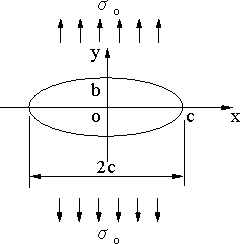 楕円孔の場合,長軸の長さc,短軸の長さb,長軸部の曲率半径ρの時,縁に生ずる最大応力σmaxは次式で与えられる。
