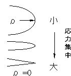 傷や,き裂等の場合は,ρ = 0と考えると,理論的には無限大の最大応力が生ずることになり,局部的に強度を越えることになる。ぜい性材料では注意する必要があるが,延性材料では,降伏応力に達すると降伏し,塑性変形するので無限大にはならない。しかし,いずれの場合も,大きな応力が生ずるのは確かである。