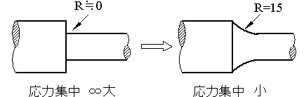 | 応力集中を引き起こす原因は,リベットの穴や,丸軸に歯車を固定するキー溝,ボルト穴などの人工的な切り欠きと,材料中に含まれる傷やき裂等の欠陥,非金属介在物などである。さらに,ミクロ的には金属格子の面状の欠陥,転位(dislocation)も応力集中の源になりうる。 設計者は,部品や部材の形が急激に変化する箇所がある場合は,応力集中を考慮して寸法を決めなくてはならない。例えば,軸の直径が変わるその境界では,一般に丸みを付けて図5のように緩やかに変える。 |