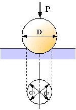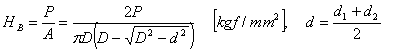 | ただし、Pは荷重〔kgf〕,Aは、くぼみの表面積〔mm2〕,Dは鋼球の直径〔mm〕,dは読取顕微鏡で読んだくぼみの直径〔mm〕である.PとdとからHBを求める表があるので実際には計算を省略することができる。 |
