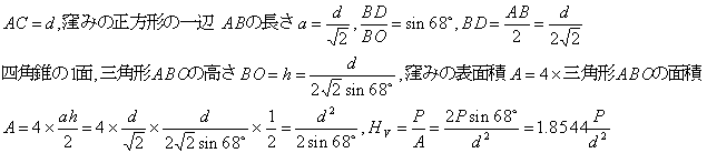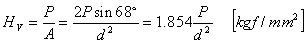 | (2). | ビッカース硬さ(Vickers hardness) この場合も荷重をくぼみの表面積で割った値をもって硬さとする.ただし、ビッカース硬さの圧子は対面角136°ダイヤモンド製の四角すいである。ビッカース硬さは次式によって求められる。 |