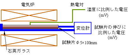 | ◆実験方法 ---- *歴史的に有名な実験方法です ・電気炉で純鉄を加熱,冷却し,試験片の長さの変化と温度を熱電対で連続的に計測する。 ・温度の計測 ---- 熱電対 温度センサー,温度に比例する電圧発生 ・長さの計測 ---- 差動トランス 変位センサー 伸び量に比例する電圧 ・温度を横軸,長さの変化を縦軸に,XY記録計に入力 ・純鉄の試験片 ---- 直径5mm,長さ50mmの丸棒 |