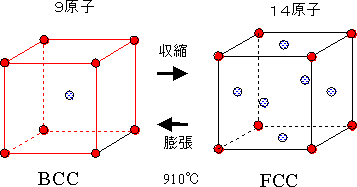 | 室温 体心立方構造 BCC 1unit 9個の原子 収縮 ↓↑ 膨張 910℃ 高温 面心立方構造 FCC 1unit 14個の原子 |