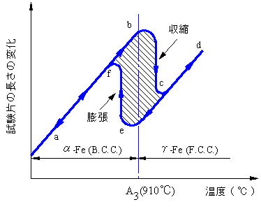![]() 図2 加熱冷却による試験片長さの変化、純鉄FeのA3変態 |