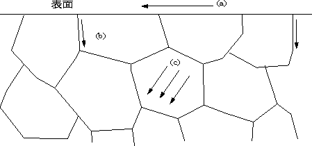 | 2.4 金属の固体拡散 固体金属中における他の元素の移動拡散は学問的にも工業的にも重要 鋼材の熱処理,結晶の成長,C元素の移動 (a).金属表面の移動,拡散 (b).結晶粒界の移動,拡散 (c).結晶格子内の移動,拡散 拡散係数D,化学反応におけるアレニュウスの式 D=Ae-Q/RT Q:活性化エネルギー, R:ガス定数,T:絶対温度,A:定数 温度が高いほど拡散係数Dは大きい |