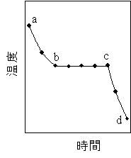 | 温度の時間的変化のグラフ(図1) ・配列状態の変化により,潜熱が発生,温度降下が遅れる ・純金属の場合の相律の適用 液相から固相に変態するとき、 成分数 n =1, 相の数r=2(液相,固相) ∴ f = n + 1 - r = 1+ 1-2 = 0 自由度=0 温度一定 b−c間の現象 ・加熱の場合は逆の現象 |