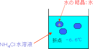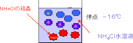 | NH4Cl水溶液 → 純粋な水の結晶:氷 ---- 初晶 氷の量が大になるにつれ水溶液のNH4Cl濃度上昇,変態温度は下降 |