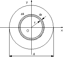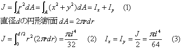| 直径d、半径dの円の中心を通り、断面に垂直な軸に関する円形断面の断面二次極モーメントJは次のように求められる。 図1のように中心からrの距離にある幅drのリング状の微少部分の面積はdA=2πrdrであるので、r2を掛けて、0からd/2まで積分する。(1)式から、対称形であるので、Ix.=Iy であり、x軸、y軸に関する断面二次モーメントは(3)式のように求まる。 |