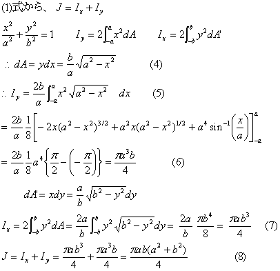 | 長軸a、短軸aの楕円形断面の断面二次極モーメントJはx軸、y軸に関する断面二次モーメントIx.Iyを求めて、(1)式のように和をとる。 Iyは微小面積dAが(4)式のようになり。断面二次モーメントの定義式に代入すると(5)式のようになる。x軸より上の半分の部分を計算し、2倍している。この積分は、文献の公式集を参考にしている。積分結果は(6)式となる。同様にIxは式(7)のようになり、断面二次極モーメントJは(8)式のようになる。 |