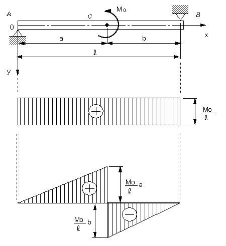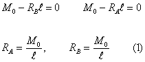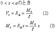 | 図のように,モーメントMoがはりに作用する場合である。モーメントの釣り合いから反力は求められる。 |