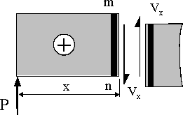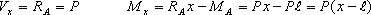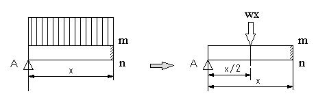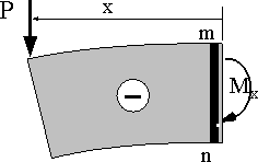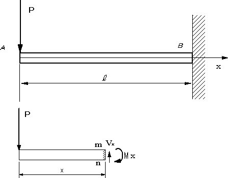| 両端支持の場合は変わりはないが、片持ちばりの場合、自由端をx軸の原点に取っている。この場合は、長さxのはりのmn断面に生ずるせん断力Vx、曲げモーメントMxを求めることになる。 | |||||