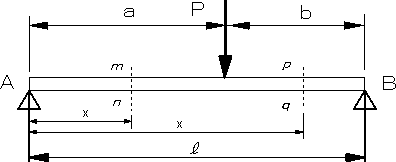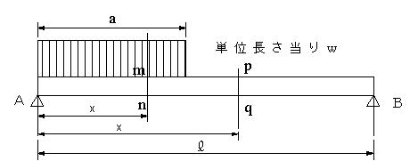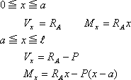 | 0<x<aの時 図10のように集中荷重wxがx/2に作用するとして、Vx=RA-wx、Mx=RA・x-wx・x/2=RA・x-wx2/2 |