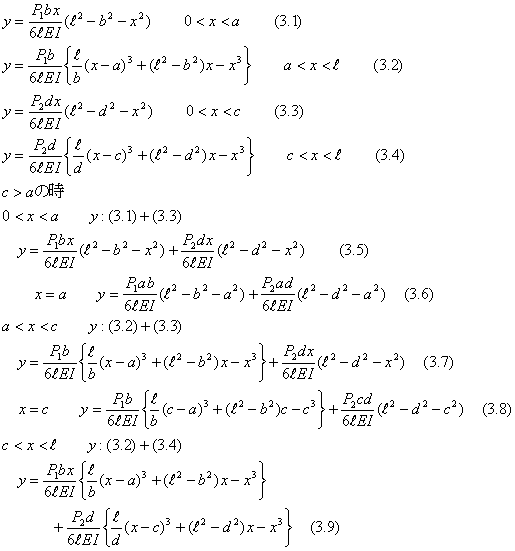 | 下記の式は、式(3.1),(3.2)において、P1→P2,a→c,b→dに置き換えた式が、それぞれ(3.3),(3.4)である。定義区間においてこれらの式を加えれば図2のP1、P2の荷重が同時に作用する場合のたわみの式が求まる。 一般的な解法と比較すると、たわみの式は同じ結果であることが解る。 |
