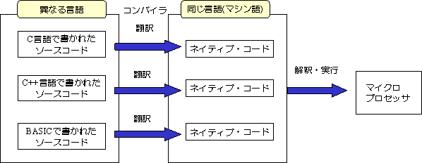 ハ−ドウェアがそのまま実行できる命令は0と1の並びからなる機械語命令であり、実際、初期には機械語を用いてプログラムを作成していた。しかし、これはおぼえにくく、見にくいので、命令を英語の略字で書くアセンブリ (assembly)言語や利用者が日常使いなれている記述法に近いBASIC、C、FORTRAN、COBOLなどいわゆる高水準(high level)言語 が考えだされた。そして、これらの言語で書いたブログラムを機械語に変換するための言語プロセッサ(lunguage processor) が作られている。システム設計用ツールや、プログラムの入力や修正に役立つブログラムデバッグ用ツールなどを含め、体系化したものをプログラム開発環境と呼んでいる。