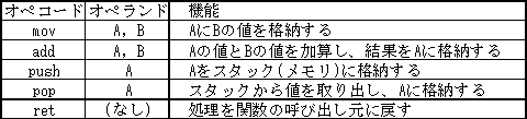 表3.1 アセンブリ言語のコードの意味