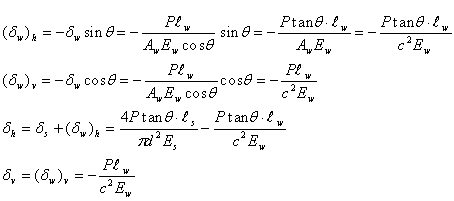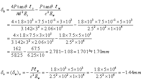 | (5). | P=1800N, lw=5m, ls=3m, d=3 mm, c=25 mm, Es=2.06×105MPa, Ew=1.00×104MPaのとき、 B点の垂直変位δv、水平変位δh を求める。 |