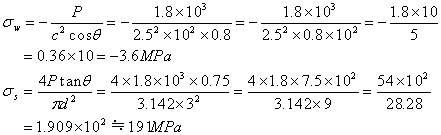 | (5). | P=1800N=1.8×103N, lw=5m=5×103 mm , ls=3m=3×103 mm , d=3 mm, c=25 mm=2.5×10mm, Es=2.06×105MPa, Ew=1.00×104MPa , tanθ=3/4=0.75=7.5×10-1を代入 |