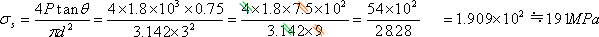 | 次式で、4項目を見ると、7.5/9、4/3.142はだいたい、1ぐらい。仮数部は1.8程度、指数部は102となるから、:計算結果は、だいたい180MPa程度のオーダーと予想できる。 |